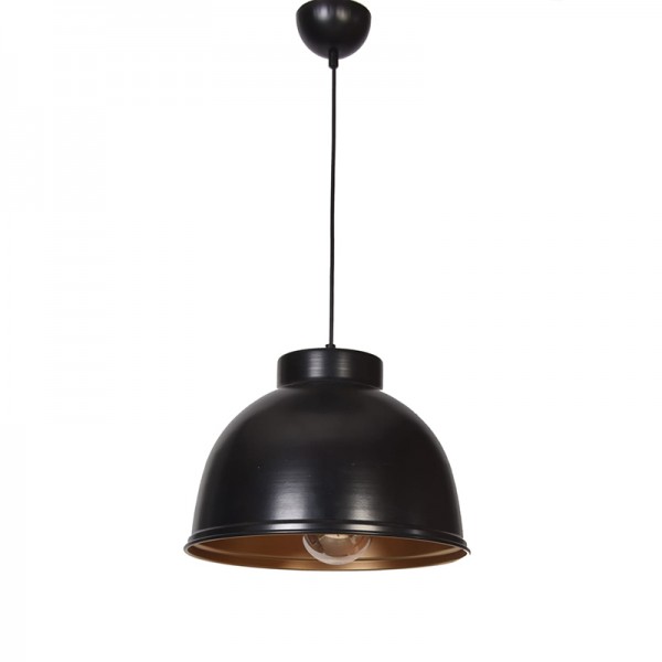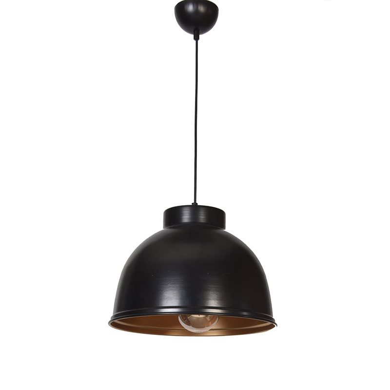 Αναβαθμίστε τον φωτισμό του χώρου σας με αυτό το εντυπωσιακό κρεμαστό φωτιστικό οροφής, που συνδυάζει μοντέρνο design και διαχρονική αισθητική. Η μαύρη μεταλλική απόχρωση στο εξωτερικό του καπέλου προσδίδει κομψότητα, ενώ το χρυσό εσωτερικό δημιουργεί μια ζεστή και ατμοσφαιρική διάχυση φωτός. Ιδανικό για τραπεζαρίες, καθιστικά, επαγγελματικούς χώρους και κάθε μοντέρνο ή industrial περιβάλλον.
