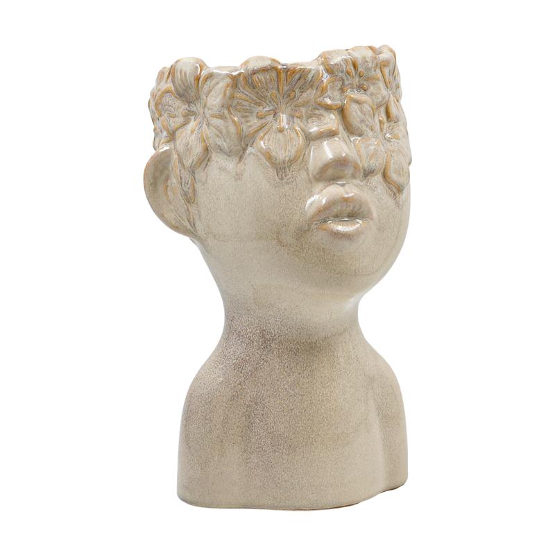 Καλλιτεχνικό κάσπο σε σχήμα κεφαλιού με floral στεφάνι! Δημιουργήστε ένα μοναδικό statement piece στον χώρο σας με αυτό το εντυπωσιακό κεραμικό που συνδυάζει την κλασική γλυπτική τέχνη με τη σύγχρονη διακοσμητική αισθητική.