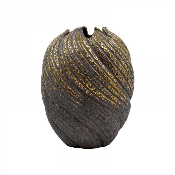 Εντυπωσιακό κεραμικό βάζο με στρογγυλή, πλατιά φόρμα και ανάγλυφη υφή, διακοσμημένο με χρυσές ή ασημένιες πινελιές που αναδεικνύουν την κομψότητά του. Ιδανικό για τοποθέτηση σε χαμηλά έπιπλα όπως τραπεζάκια σαλονιού, ράφια ή κονσόλες. Προσδίδει μοντέρνα αλλά και διαχρονική αισθητική σε κάθε χώρο.