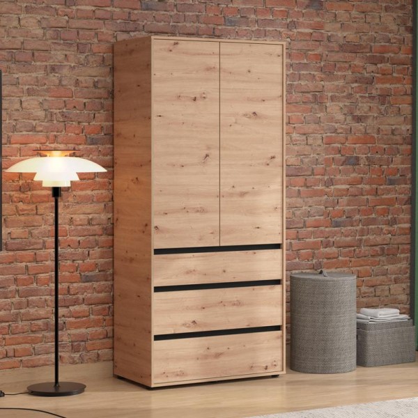 Η ντουλάπα Corbett είναι η ιδανική λύση για οργανωμένη αποθήκευση ρούχων και αξεσουάρ.Διαθέτει δύο πόρτες, που ανοίγουν σε έναν ευρύχωρο εσωτερικό χώρο, εξοπλισμένο με ράγα για κρέμασμα ρούχων, εξασφαλίζοντας ότι τα ρούχα σας θα παραμείνουν χωρίς ζάρες και τακτοποιημένα. Επιπλέον, διαθέτει τρία ευρύχωρα συρτάρια, ιδανικά για μικρότερα αντικείμενα, όπως εσώρουχα, αξεσουάρ ή λευκά είδη, προσφέροντας εύκολη πρόσβαση και μέγιστη οργάνωση.