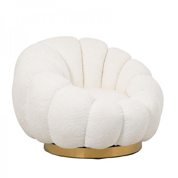 Η περιστρεφόμενη πολυθρόνα Delori συνδυάζει το μοντέρνο και το κλασικό, με ένα εξαιρετικά εκλεπτυσμένο σχέδιο. Το ύφασμα με μπουκλέ υφή προσφέρει μία αίσθηση πολυτέλειας και εξαιρετικής ποιότητας, ενώ η μεταλλική βάση σε χρυσό χρώμα προσδίδει μία ιδιαίτερη και κομψή πινελιά στο χώρο. Ο μηχανισμός περιστροφής εξασφαλίζει άνεση και ευχρηστία, επιτρέποντας την εύκολη και αθόρυβη κίνηση της πολυθρόνας σε όλες τις κατευθύνσεις.