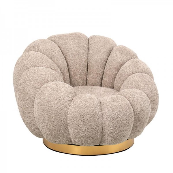 Η περιστρεφόμενη πολυθρόνα Delori συνδυάζει το μοντέρνο και το κλασικό, με ένα εξαιρετικά εκλεπτυσμένο σχέδιο. Το ύφασμα με μπουκλέ υφή προσφέρει μία αίσθηση πολυτέλειας και εξαιρετικής ποιότητας, ενώ η μεταλλική βάση σε χρυσό χρώμα προσδίδει μία ιδιαίτερη και κομψή πινελιά στο χώρο. Ο μηχανισμός περιστροφής εξασφαλίζει άνεση και ευχρηστία, επιτρέποντας την εύκολη και αθόρυβη κίνηση της πολυθρόνας σε όλες τις κατευθύνσεις.