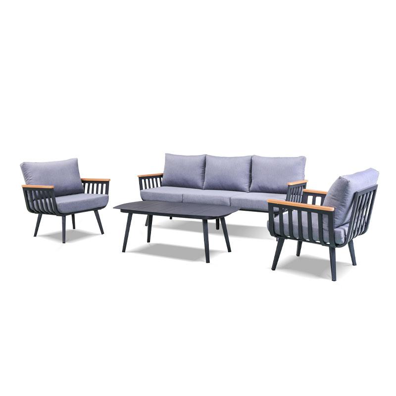 Το σαλόνι κήπου Estela είναι ένα πρακτικό, εντυπωσιακό και καλαίσθητο μοντέλο σαλονιού εξωτερικού χώρου το οποίο αποτελείται από ενα διθέσιο καναπέ , δυο πολυθρόνες και ένα τραπέζι. Είναι κατασκευασμένο από αλουμίνιο και Polywood ένα υλικό που παράγεται από 100% ανακυκλώσιμη πλαστική ξυλεία και άλλες συνθετικές ύλες σε πολύ υψηλές θερμοκρασίες και αποτελεί την νέα τάση για την επίπλωση του εξωτερικού χώρου.