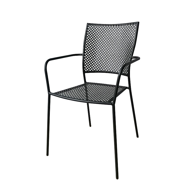 Μεταλλική καρέκλα με διάτρητο σχέδιο στην πλάτη και το κάθισμα. Σταθερός σκελετός από εξαιρετικής ποιότητας μέταλλο ηλεκτροστατικής βαφής με αντοχή στην καταπόνηση και στη φθορά από τις καιρικές συνθήκες. Με δυνατότητα στοίβαξης, κατάλληλη για εξωτερική και επαγγελματική χρήση. Για περισσότερη άνεση συνδυάστε πολύχρωμα μαξιλάρια πλάτης ή καθίσματος.