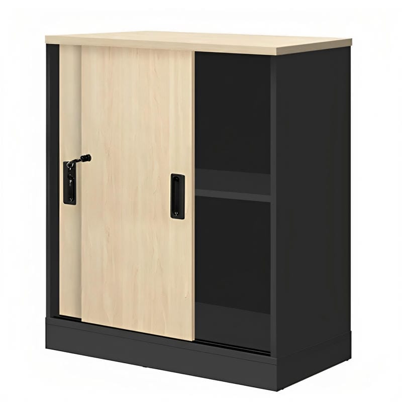 Ντουλάπι γραφείου με δύο ράφια που θα αποτελέσει μια καλή λύση αποθήκευσης και οργάνωσης για το γραφείο σας. Οι συρόμενες πόρτες του κλειδώνουν για την αποθήκευση και προφύλαξη πολύτιμων εγγράφων ή αντικειμένων.