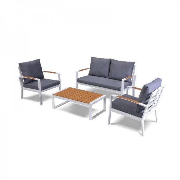 Το σαλόνι κήπου Domenico είναι η ιδανικότερη επιλογή σας. Αποτελείται από ενα διθέσιο καναπέ , δυο πολυθρόνες και ένα τραπέζι. Είναι κατασκευασμένο από αλουμίνιο και Polywood ένα υλικό που παράγεται από 100% ανακυκλώσιμη πλαστική ξυλεία και άλλες συνθετικές ύλες