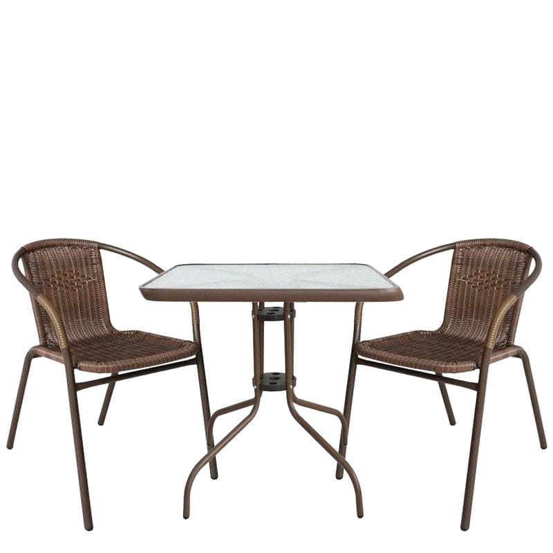 Το σετ περιλαμβάνει ένα τετράγωνο τραπέζι με μεταλλικό σκελετό και επιφάνεια από γυαλί tempered, καθώς και δύο πολυθρόνες με μεταλλική βάση και επιφάνεια καθίσματος και πλάτης από rattan. Οι πολυθρόνες διαμορφώνουν σταθερές θέσεις καθίσματος γύρω από το τραπέζι, με ενιαία μορφή και σαφή διάταξη.