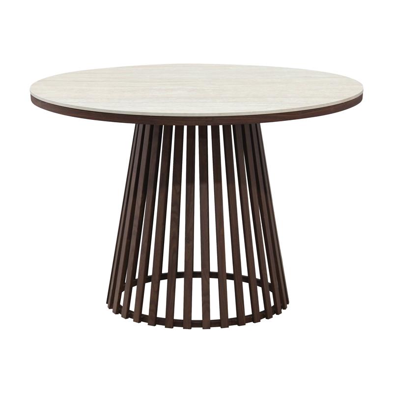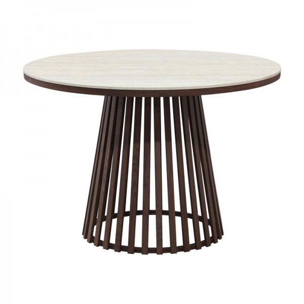 Αυτό το στρόγγυλο τραπέζι με κεραμικη επιφάνεια πάχους 1,2εκατοστών, που στηρίζεται σε μια επίσης στρόγγυλή μεταλλική κατασκευή με πολλές δοκούς που ενώνονται μεταξύ τους με δακτυλίους στην εσωτερική πλευρά. Το αποτέλεσμα είναι ένα μοναδικό έπιπλο που συνδυάζει την πρακτικότητα με το εντυπωσιακό design, ιδανικό για μοντέρνους και minimal χώρους τραπεζαρίας.