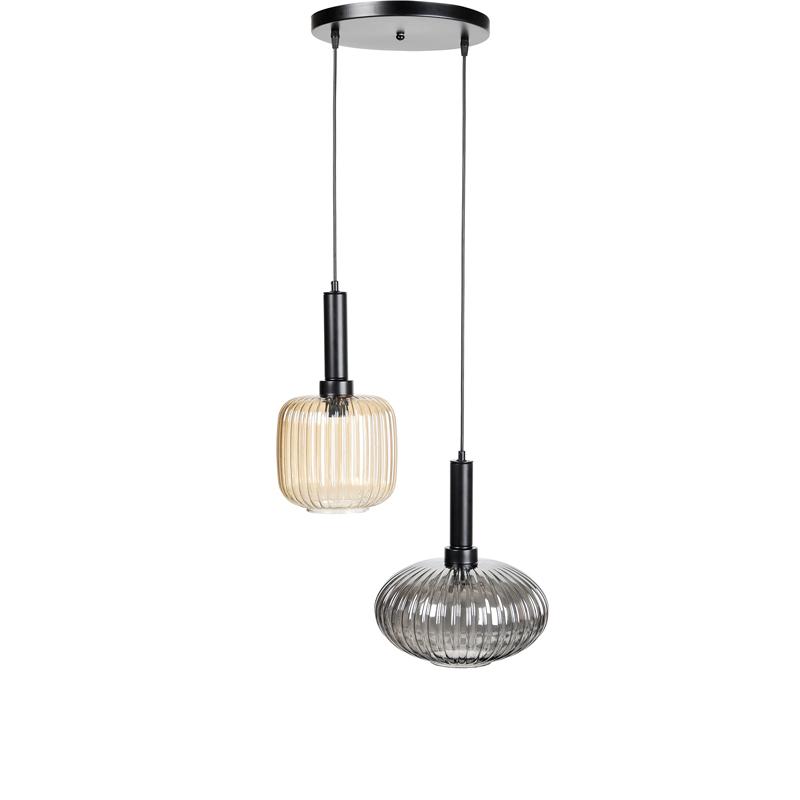 Σύγχρονο δίφωτο φωτιστικό οροφής με δύο γυάλινες αποχρώσεις σε αποχρώσεις φιμέ και amber, που δημιουργούν ατμοσφαιρικό φωτισμό με ιδιαίτερο χαρακτήρα. Η διαφορετική μορφή και ύψος των γυάλινων καπέλων προσθέτει δυναμισμό στο design, ενώ η μαύρη μεταλλική βάση ενισχύει τη μοντέρνα αισθητική. Ιδανική πρόταση για σαλόνια, τραπεζαρίες ή επαγγελματικούς χώρους.