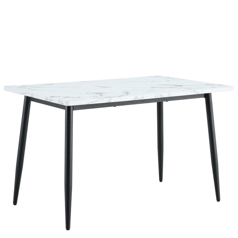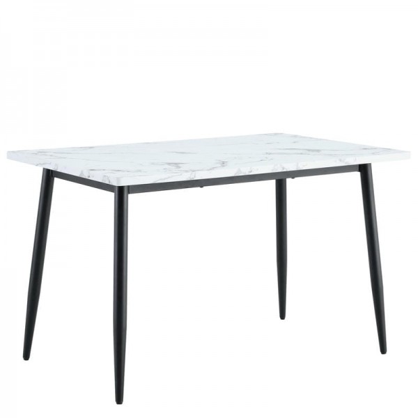 Κατασκευασμένο από μοριοσανίδα υψηλής ποιότητας με λευκό μαρμάρινο φινίρισμα και ανθεκτικό μαύρο μέταλλο, το τραπέζι εξασφαλίζει σταθερότητα και αντοχή στη χρήση. Τα υλικά του είναι ανθεκτικά στις καθημερινές φθορές.