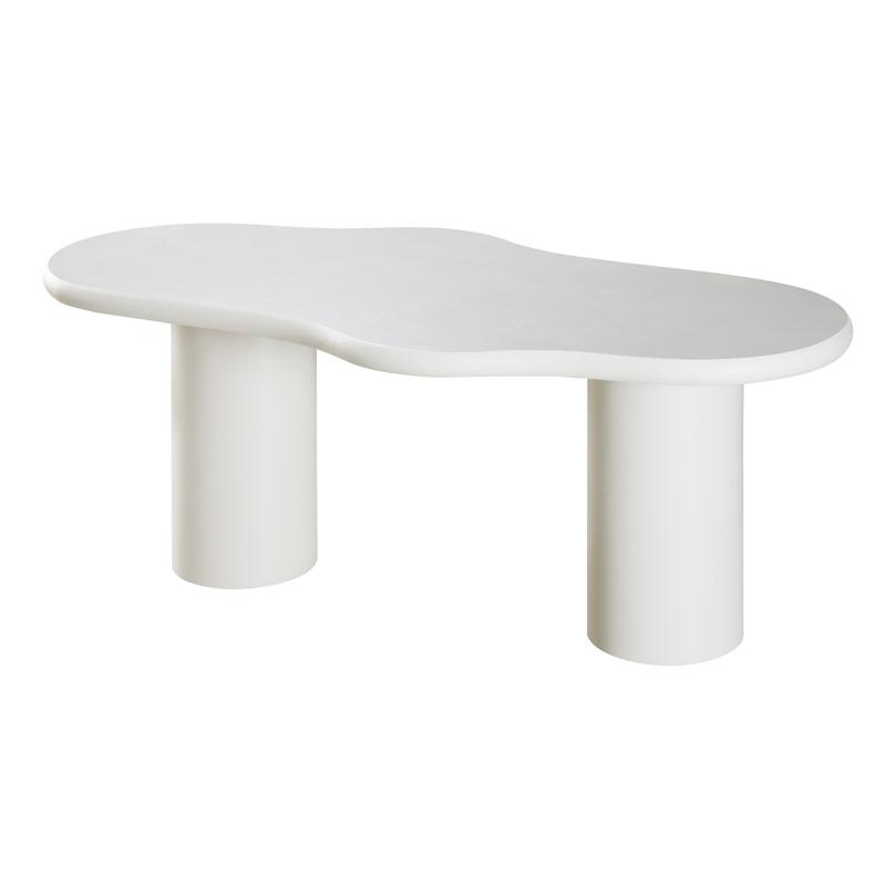 Ένα ιδιαίτερο τραπέζι τραπεζαρίας με εντυπωσιακό σχεδιασμό διπλής επιφάνειας, που συνδυάζει οργανικές καμπύλες με μοντέρνα αισθητική. Η λευκή απόχρωση σε υφή τσιμέντου δημιουργεί ένα minimal αλλά εντυπωσιακό στοιχείο στον χώρο. Ιδανικό για σύγχρονες τραπεζαρίες ή loft χώρους με βιομηχανικό χαρακτήρα.